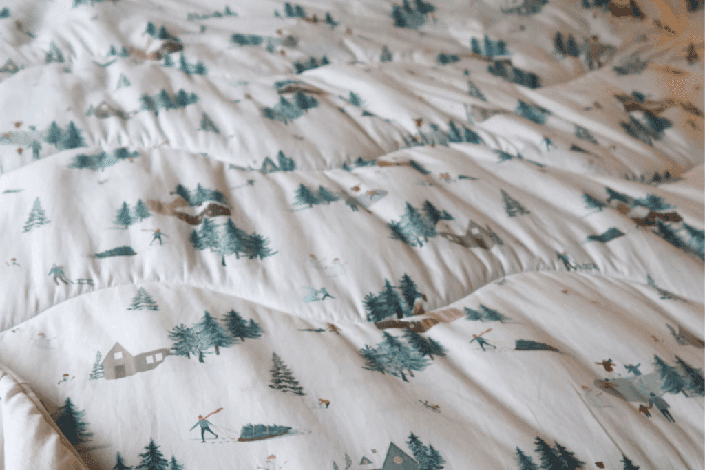 We were sent a King Size Night Lark coverless duvet in their festive Snow Day design – a neutral white duvet dappled with fir trees. The Night Lark Coverless duvet is available in a choice of designs, including linens, herringbone and natural cotton, in sizes from Single to Super King. There is a choice of two thicknesses available – a 10.5 tog coverless duvet for all year-round warmth and a 4.5 tog coverless duvet for the summer months.